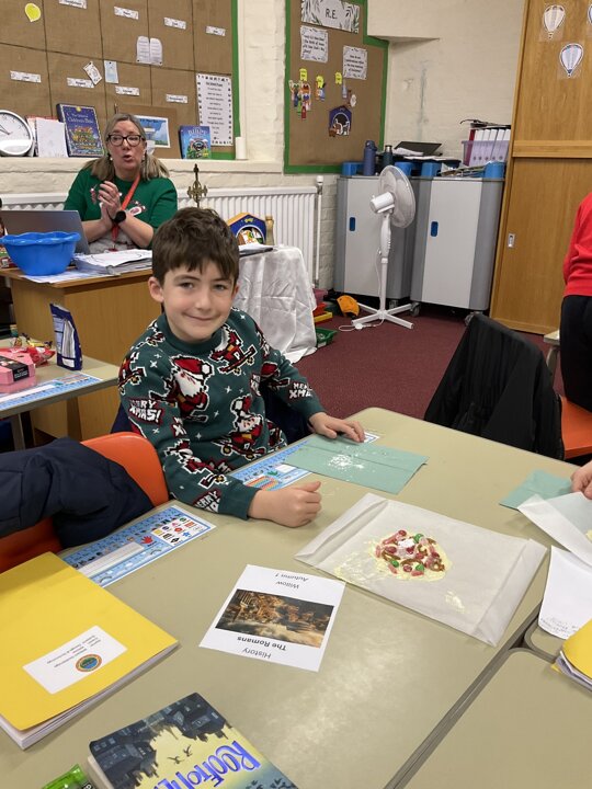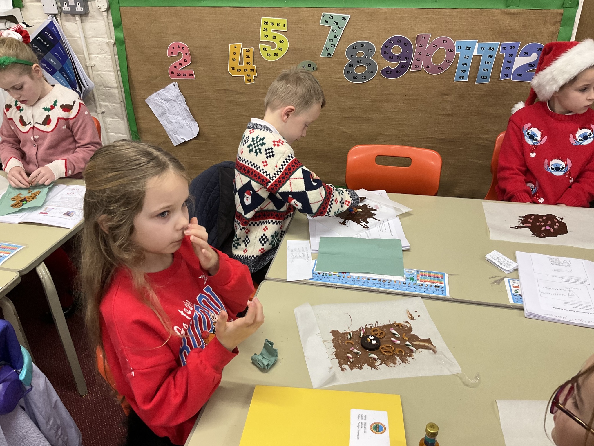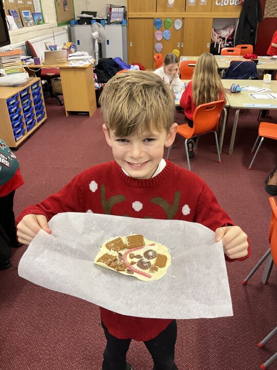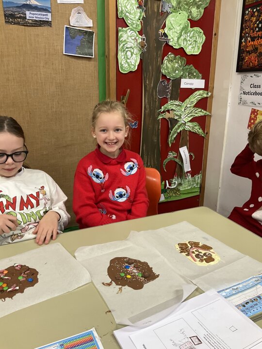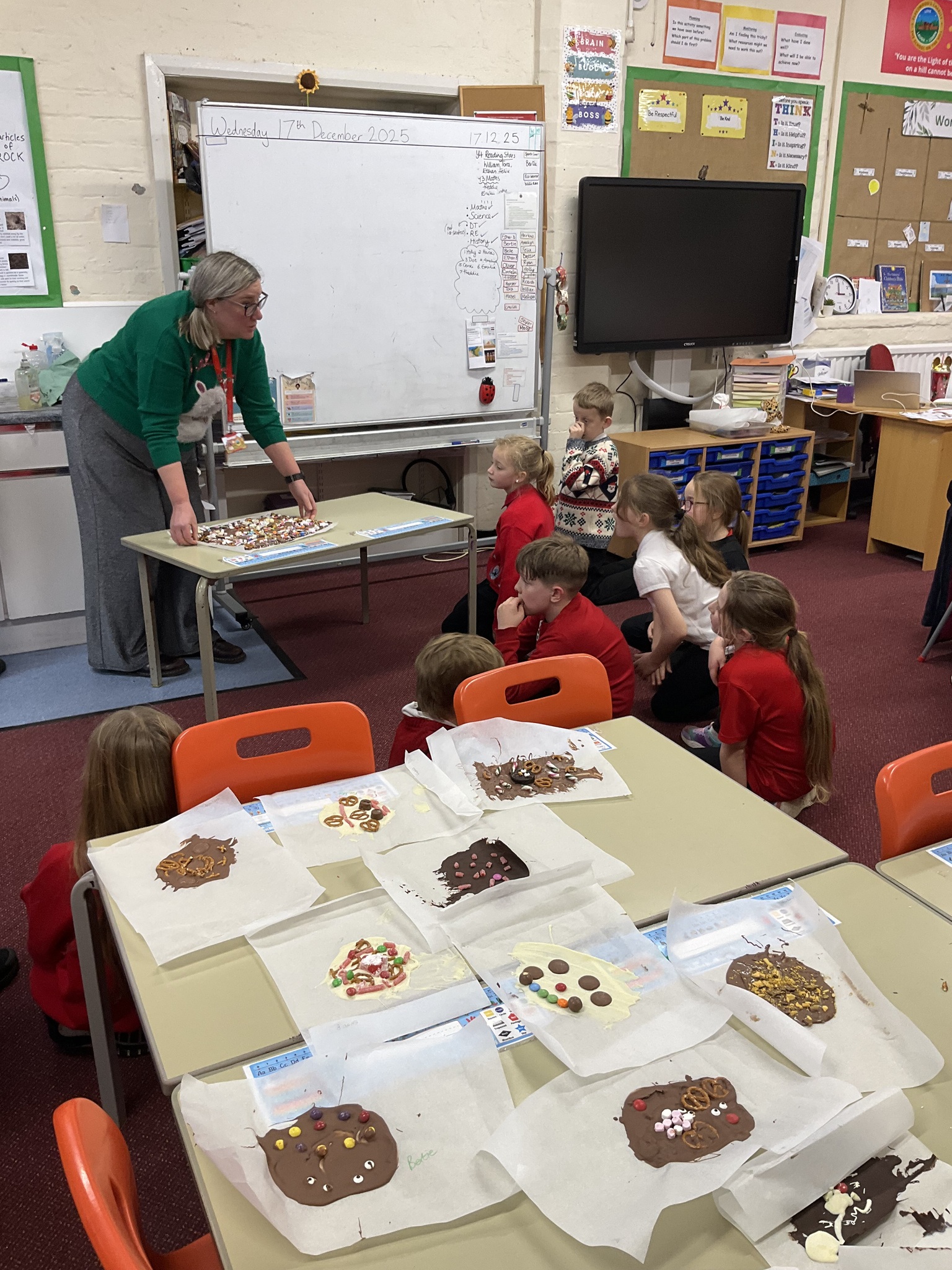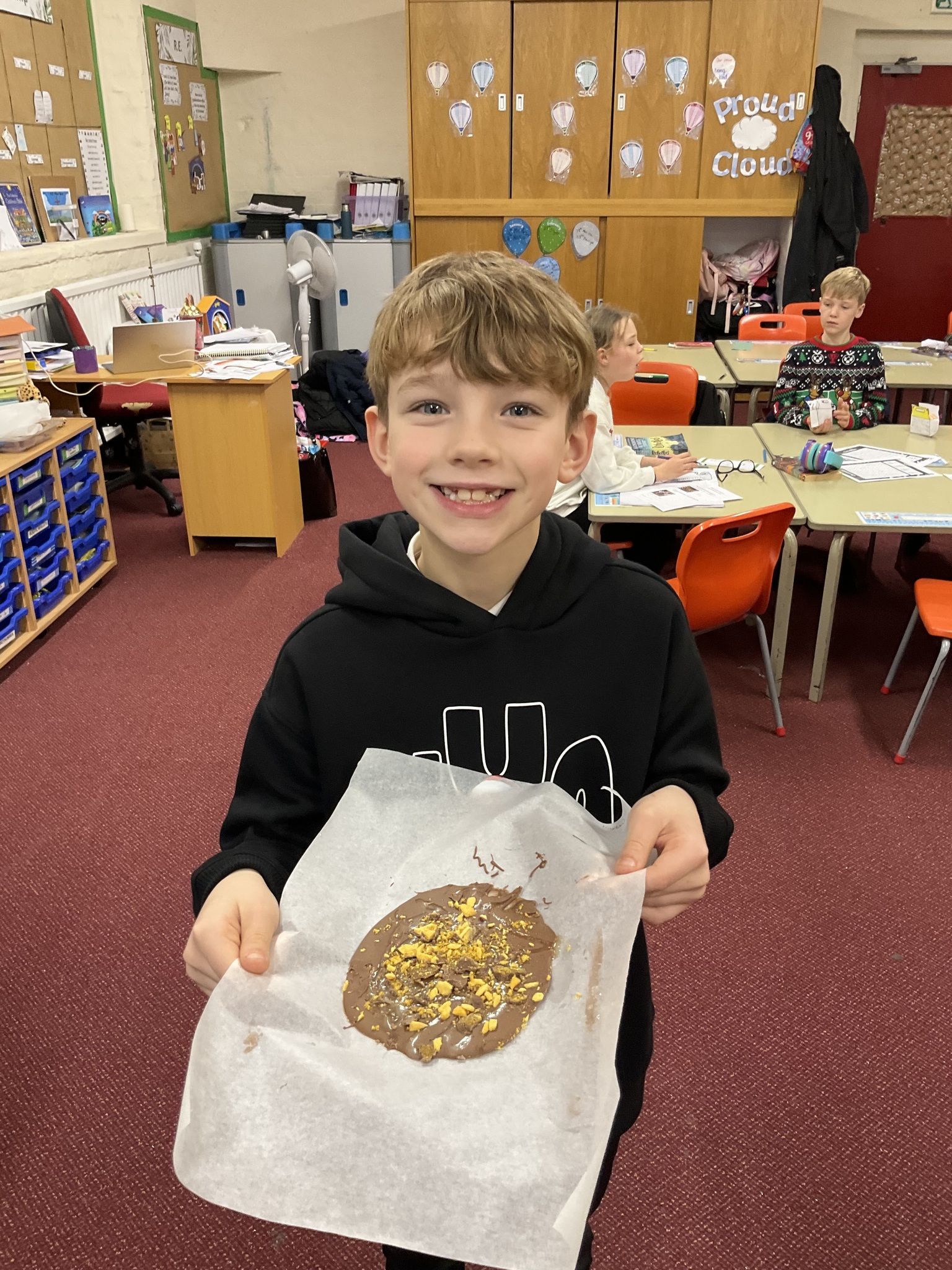 A lovely morning making our chocolate bark! The final lessons of our DT project saw us making our bark, with our chosen toppings and then putting them into our pre-made packaging. A great way to get into the Christmas spirit!